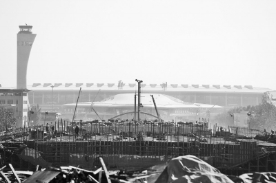 航站樓前,迎賓高架工程正在建設(shè)之中